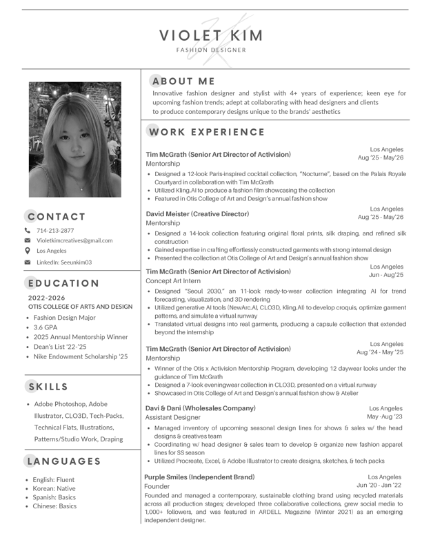 My experience spans concept development and industry collaboration, including an internship at Activision and styling published editorials for KALTBLUT Magazine. As a 2026 FSF Scholar, I explored adaptive and inclusive design through my case study, Nike x Milano Cortina Paralympics. Originally from Seoul and having lived in Shanghai, Singapore, and California, I bring a global perspective and an open-minded, experience-driven approach to design and visual storytelling.
